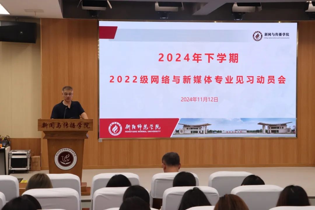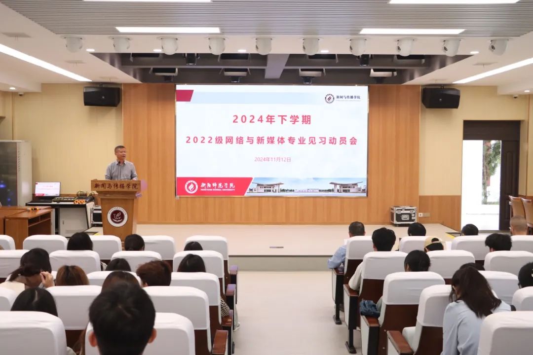 2024年11月12日下午,22级网络与新媒体专业见习动员大会在文科楼A多功能演播厅顺利召开。