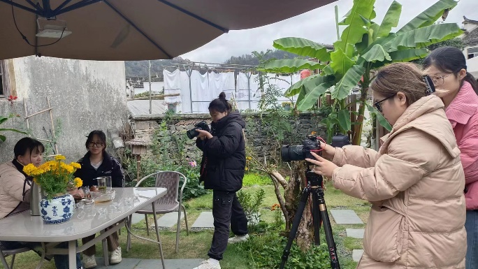 他们今天穿梭于宏村与西递的小巷之间,用镜头捕捉着动人的瞬间,水波粼粼的宏村水系成了他们镜头下的主角,镜头下的水流仿佛有了生命,讲述着古村落的悠悠岁月。他们不仅捕捉到了水流在村落中的独特作用,还通过空镜头的拍摄,巧妙地串联起了整个村落的美景,让人仿佛置身于一幅动人的水墨画中。