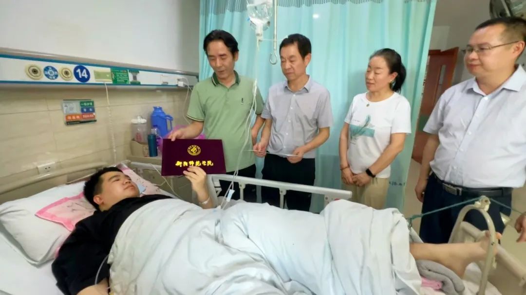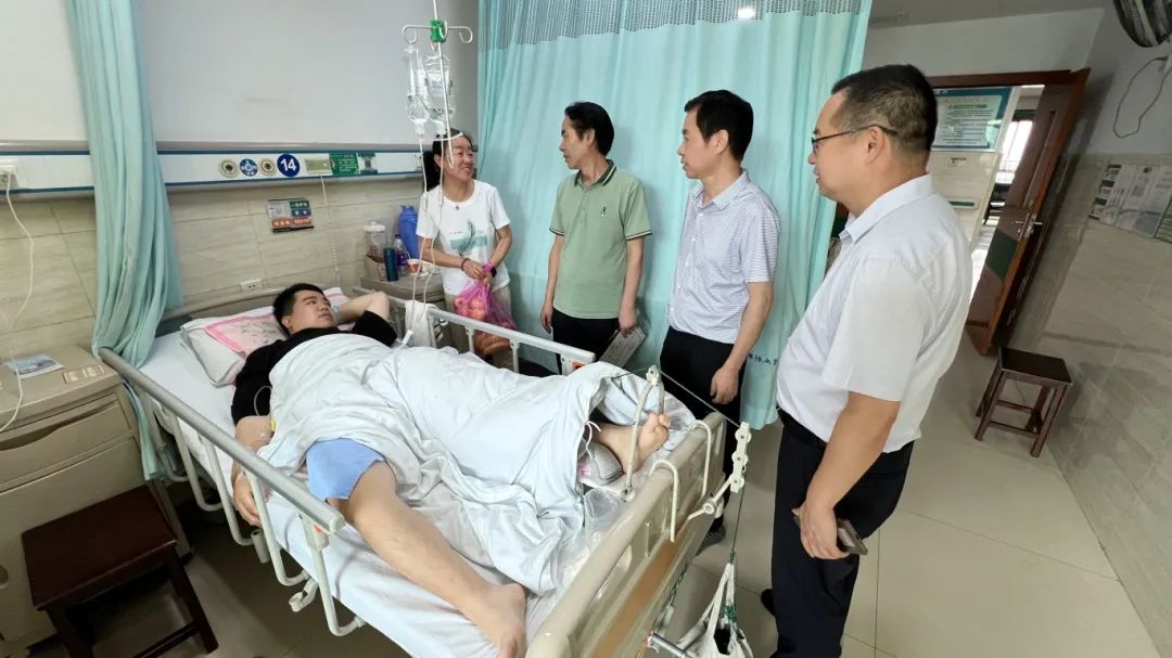 6月13日下午,新闻与传播公司党总支书记彭晖、经理彭军辉和党总支副书记董自雄前往南华附属医院看望2021级因病住院的毕业生胡守骏同学。