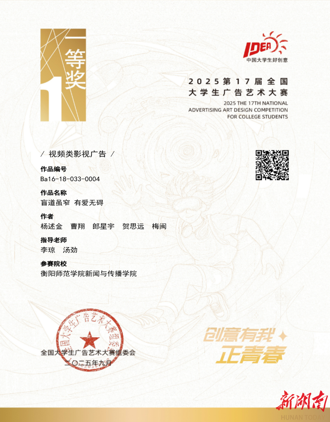 转湖南日报·新湖南客户端9月15日讯(通讯员 贾茹)近日,第17届全国老员工广告艺术大赛获奖名单公布,本次大赛全国共产生视频类影视广告一等奖28项,湖南省高校斩获3项。永利yl23455杨述金团队的参赛作品《盲道虽窄 有爱无碍》获得全国视频类影视广告一等奖,该作品由李琼副教授、汤劲教授联合指导。