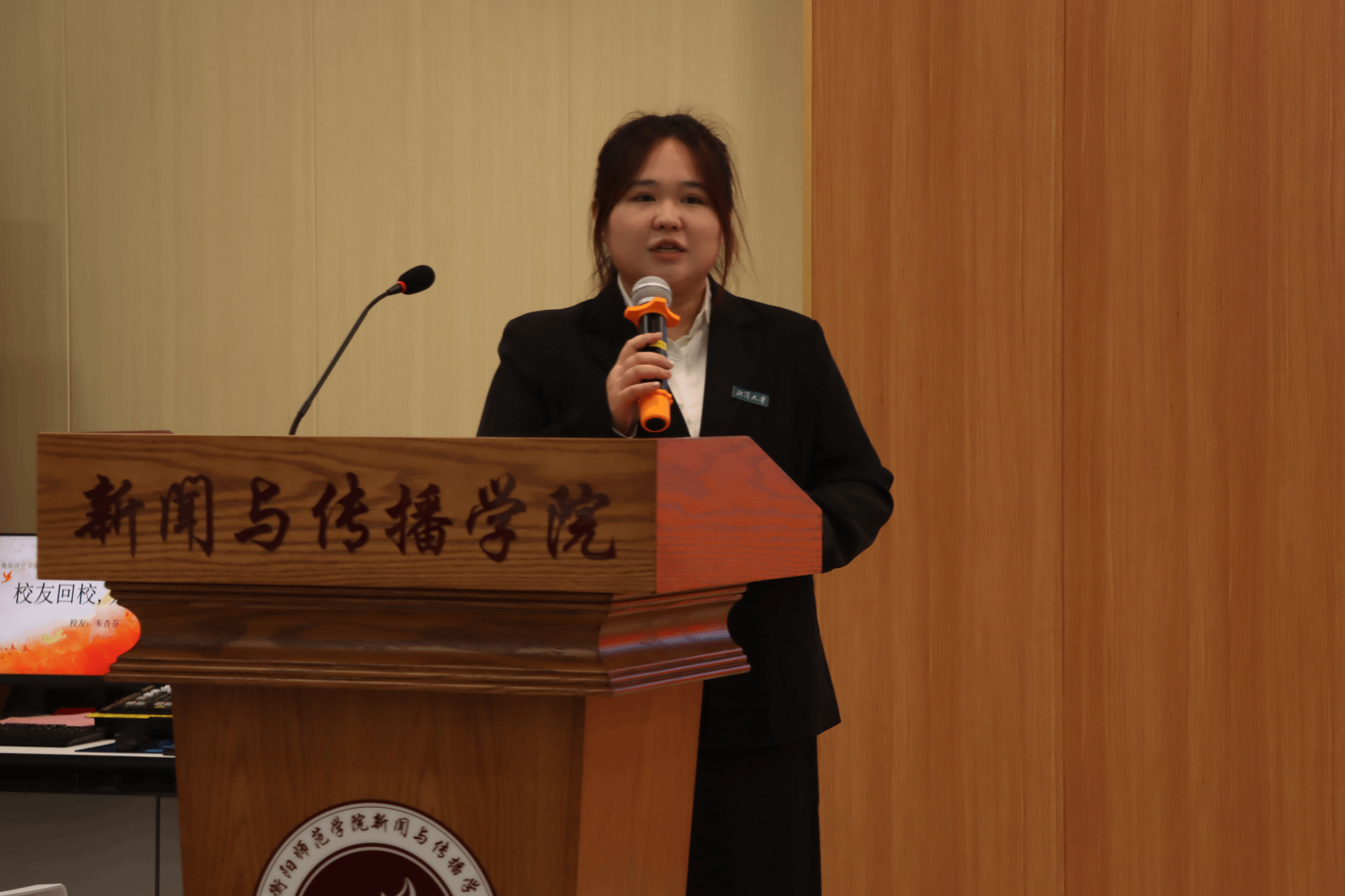 在实践方面,朱杏芬以自身在薪火传媒的实践经历为切入点,强调“实践是最好的老师”。任职期间,她在内容采编、摄影摄像等实战工作中积累了大量经验,在省级媒体发布稿件20余篇,其中一篇稿件阅读量高达20万余人次。她鼓励学弟学妹要敢于尝试、不怕犯错、主动“折腾”。同时特别提到,公司为同学们提供了薪火传媒、工作坊课程、专业见习等宝贵的实战机会,大家应学会利用这些资源,主动对接、深度参与,在实战中不断提高自己的专业能力。并且结合当前新传行业的人才需求趋势,朱杏芬提出新传人要争当“六边形战士”,打破“单一技能依赖”的局限。她解释道,如今媒体行业更青睐“全方位”人才,仅掌握单一技能难以满足岗位需求,必须同步培养写、拍、剪等多维度能力,让全面能力成为自身的核心竞争力。此外,她还特别强调沟通协作能力的重要性,认为在团队项目中,精准表达需求、合理使用话术,能大幅提升工作效率。