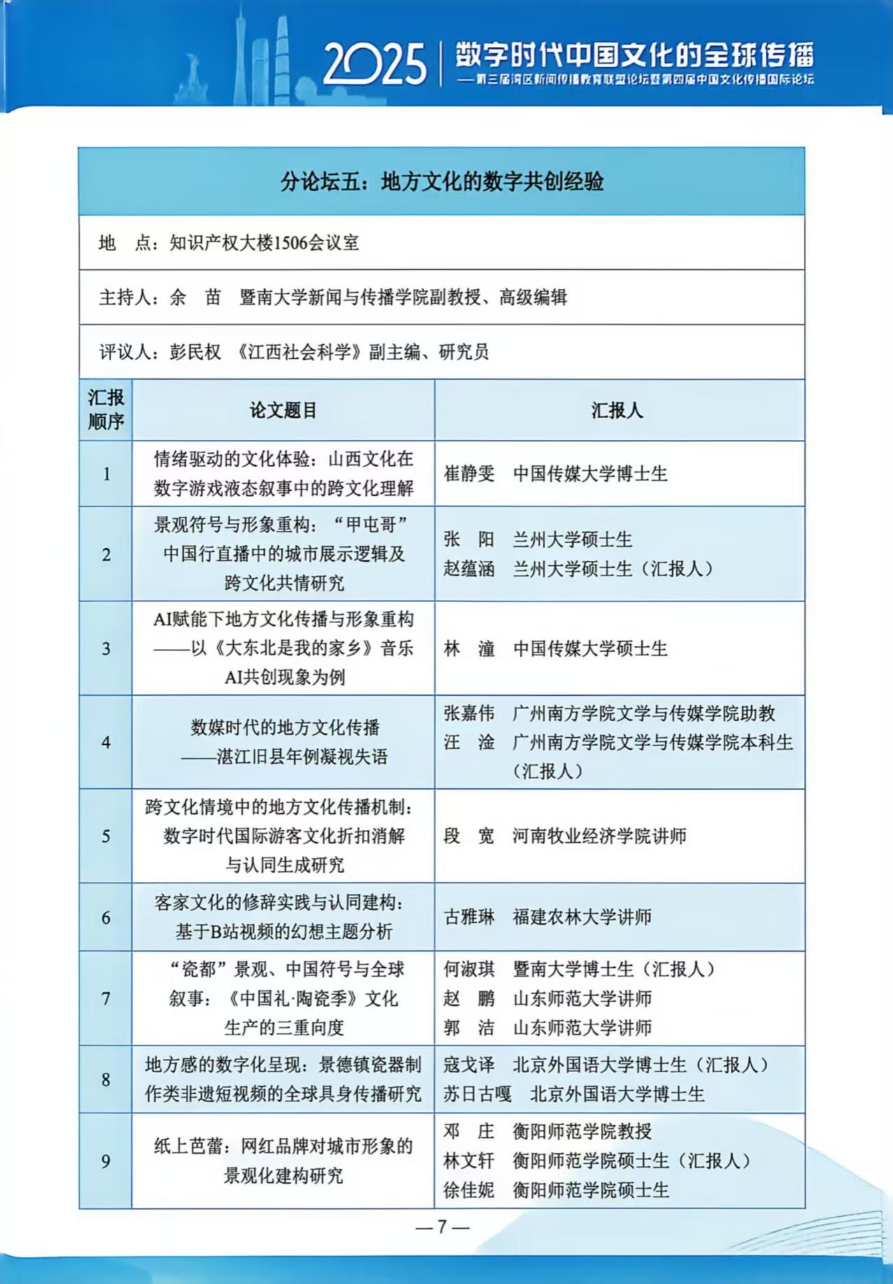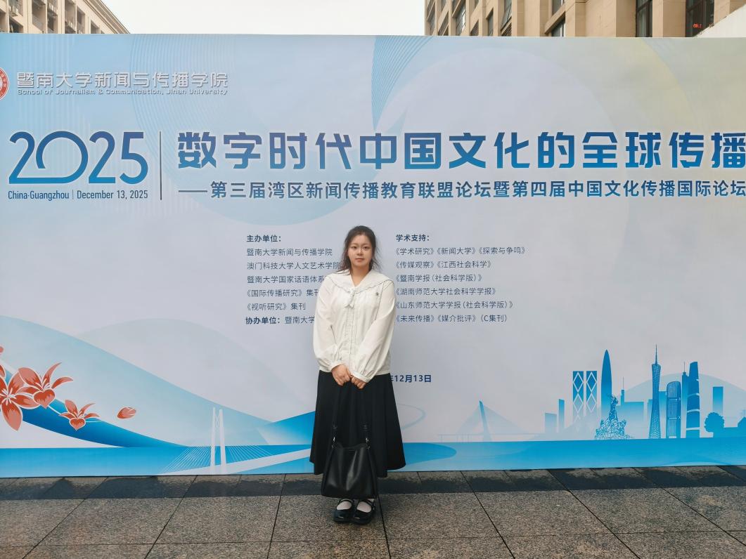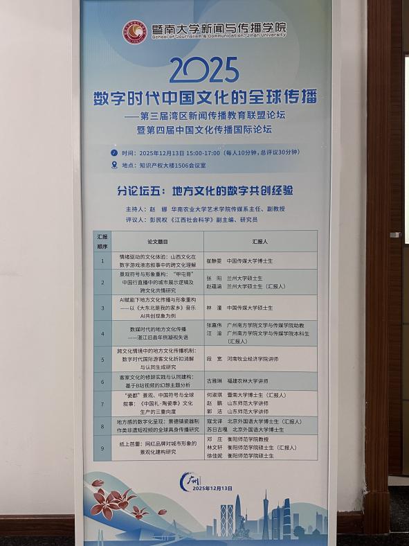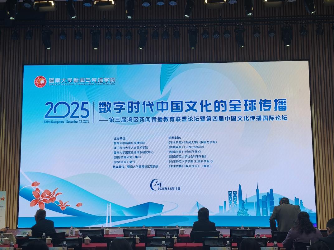 2025年12月13日,由暨南大学永利yl23455、暨南大学国家话语体系研究中心、《视听传播》集刊、《国际传播研究》集刊主办的“第三届湾区新闻传播教育联盟论坛暨第四届中国文化传播国际论坛”在广州成功举行。本届论坛主题为“数字时代中国文化的全球传播”,来自全国多所高校及研究机构的专家学者、青年学子与会。公司邓庄教授及其指导的硕士研究生林文轩、徐佳妮受邀参加此次论坛,并在会上进行学术成果展示与交流。