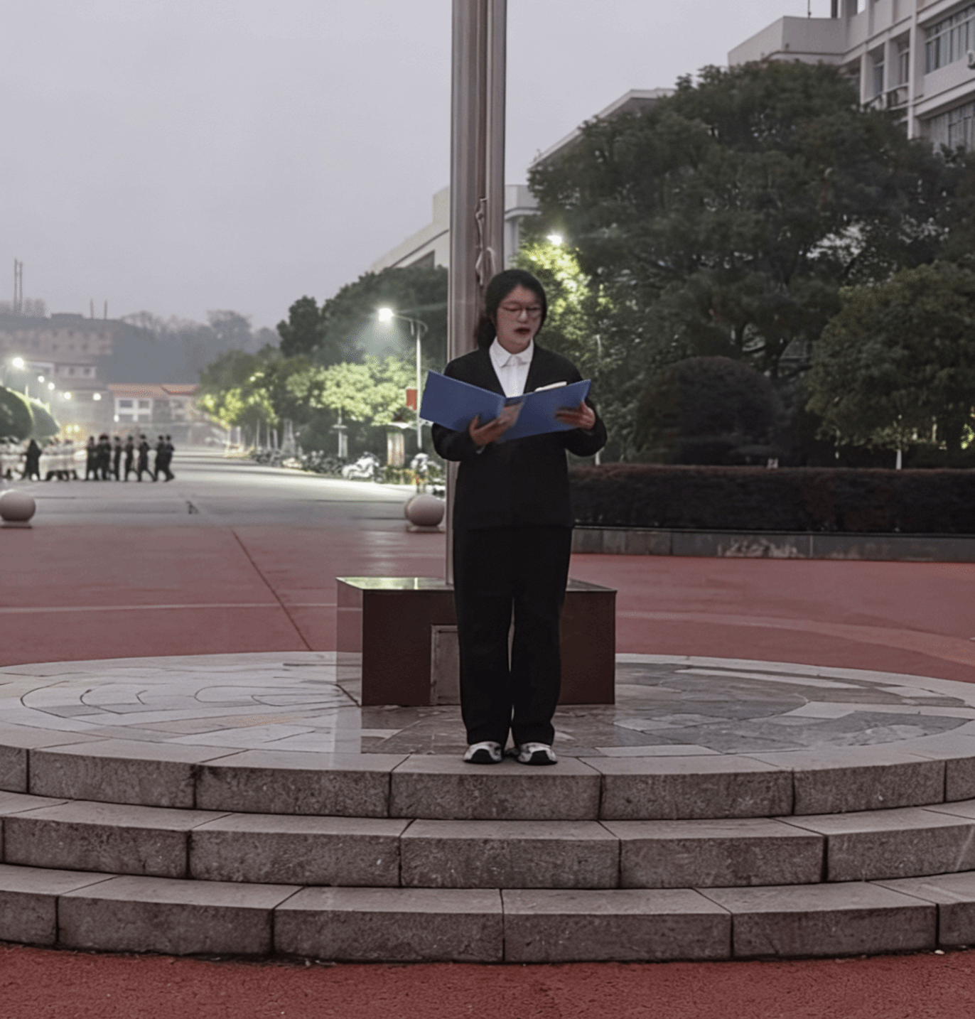 来自2024级新闻学二班的宾慧作为员工代表在国旗下进行发言。她借澳门回归纪念日强调个人与祖国命运相连,分享自身校园学习、实践奋斗经历,号召同学以奋斗践行校训,助力民族复兴。
