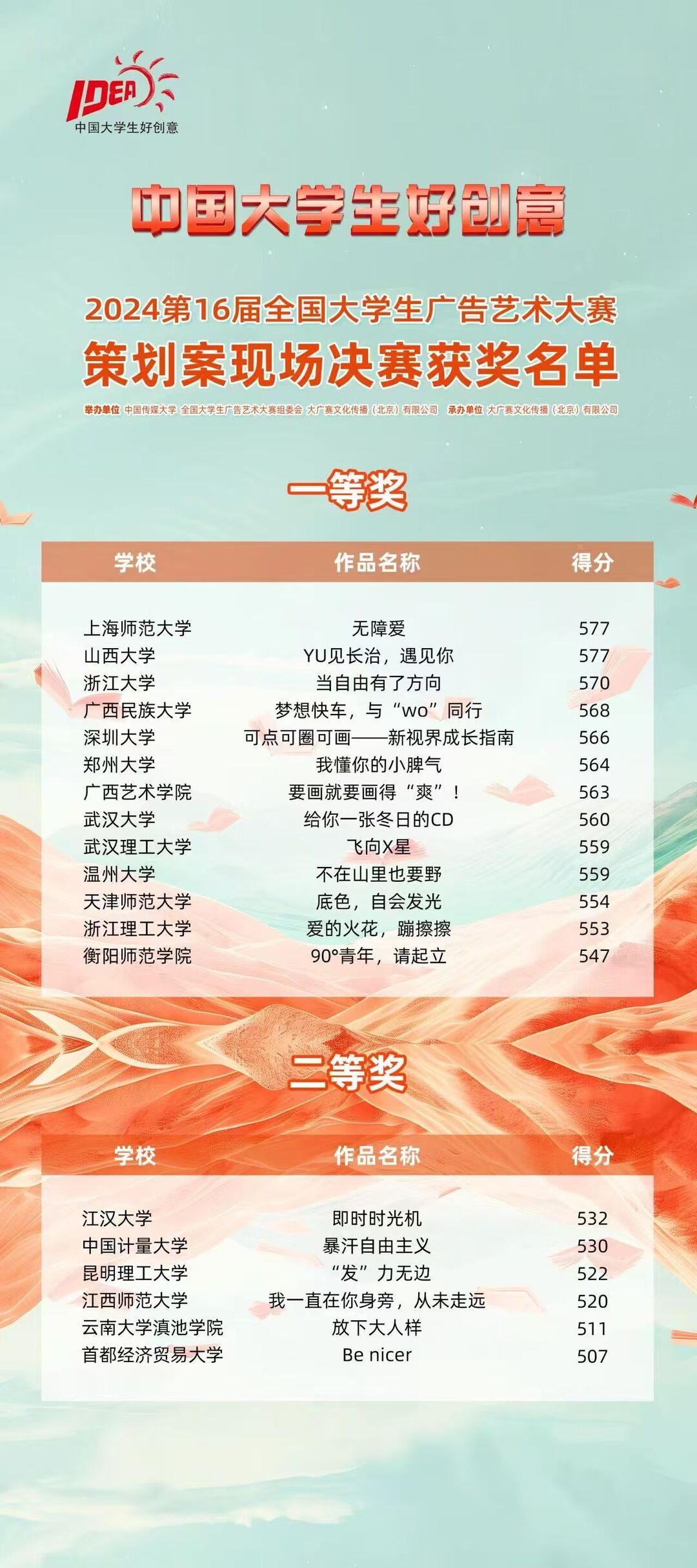 湖南日报·新湖南客户端9月11日讯(通讯员 贺琪 黄佳琳 唐虹)9月8日,第16届全国老员工广告艺术大赛(以下简称大广赛)获奖名单公布,永利yl23455获得国赛策划案类一等奖,此外还获得省赛一等奖4项、二等奖5项、三等奖10项。