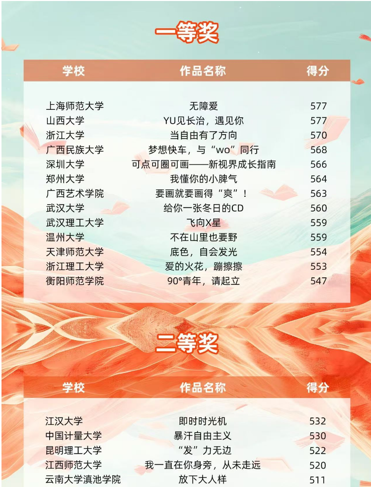 公司员工在2024年第十六届全国老员工广告艺术大赛中荣获一等奖1项、三等奖4项,其中策划案一等奖,实现了公司在国赛中一等奖零的突破!同时,在湖南省省赛中,公司也斩获一等奖4项、二等奖5项、三等奖10项!为新传贺!为新传师生贺!