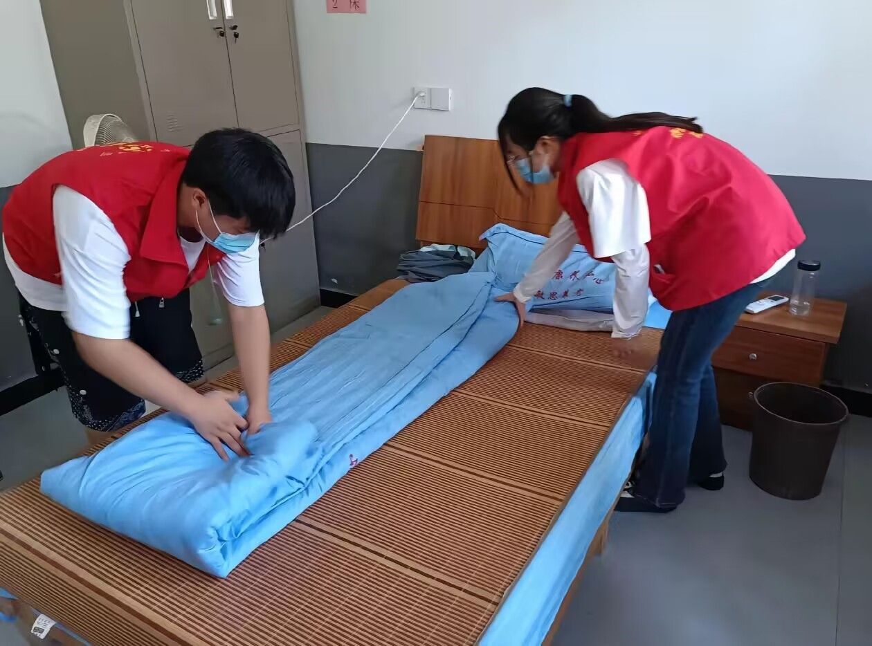 参加活动员工为老人整理被子