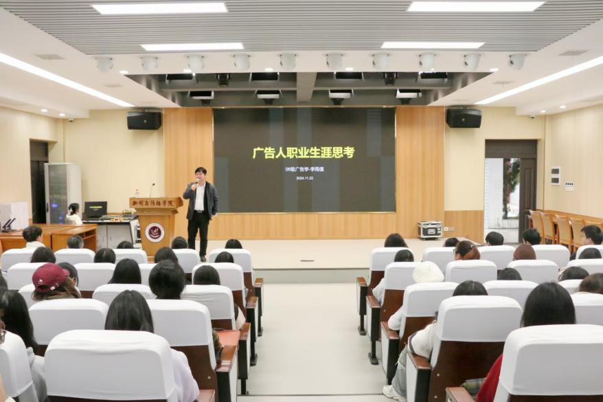他山之石,可以攻玉。在这场精彩的讲座中,李雨值员工以其丰富职业生涯经验为同学们打开了广告世界的新大门。从迷茫的大学时光到辉煌的职业成就,他的故事激励着每一位学子勇敢探索自己的未来。同时,我们也期待更多的优秀员工能够回到母校,分享他们的成功经验,为学弟学妹们的成长之路提供指路明灯。2023级研究生和2022、2023、2024级广告学员工听取讲座。